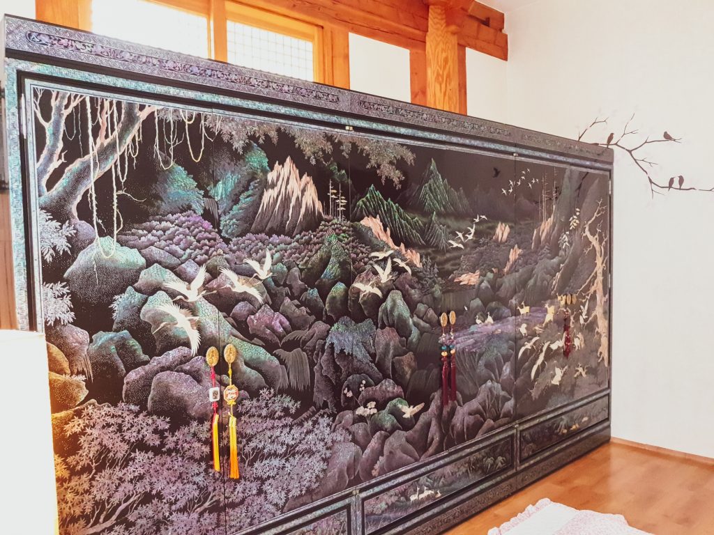 산수화 화폭이 담긴 자개장에 옷과 이불을 보관합니다.